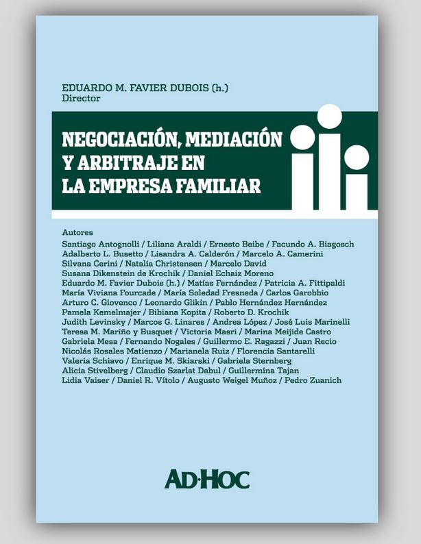 La planificación sucesoria en la prevención y resolución de conflictos en empresa y familia, por L. Glikin. Los métodos alternativos al litigio como instrumento adecuado para la gestión y resolución de conflictos en las empresas de familia, por T. M. Mariño y Busquet. Las ventajas comparativas de los ADR para la solución de conflictos en el seno de las empresas familiares, por D. R. Vítolo. La negociación en la empresa familiar: Teoría y herramientas de la negociación, por S. Cerini. Manteniendo la familia y los negocios. Transformando la zona de conflicto en zona de acuerdo, por A. Stivelberg. Los espacios de negociación en la organización interna de la empresa familiar. Nuevas tendencias teóricas para su análisis, por M. V. Fourcade. Algunas consideraciones respecto de la negociación en el marco de una empresa, por M. Meijide Castro. Cómo destrabar conflictos en la empresa familiar, por P. A. Fittipaldi y F. Santarelli. El método de “mentoring” para comprender y llevar adelante negociaciones exitosas en las empresas familiares, por E. Beibe y M. Ruiz. La mediación en la empresa familiar: “Entrenar” a la familia empresaria. Procesos y técnicas para analizar,………